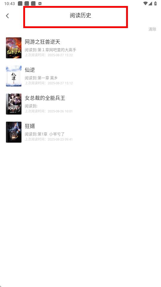 3、进入后即可查看阅读历史记录,其中会显示阅读书籍的名称、阅读进度以及上次阅读时间等信息。