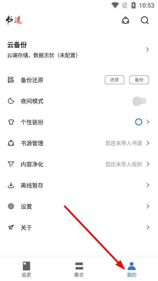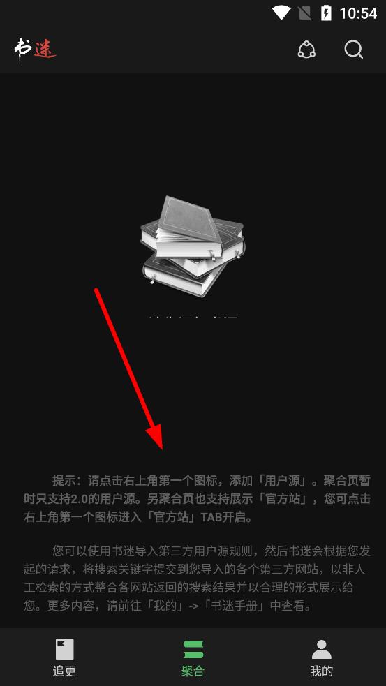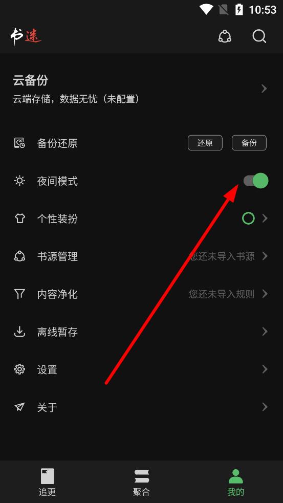 3、开启夜间模式后,返回应用主界面,如在聚合页等界面,即可在夜间模式下使用书迷应用阅读。
