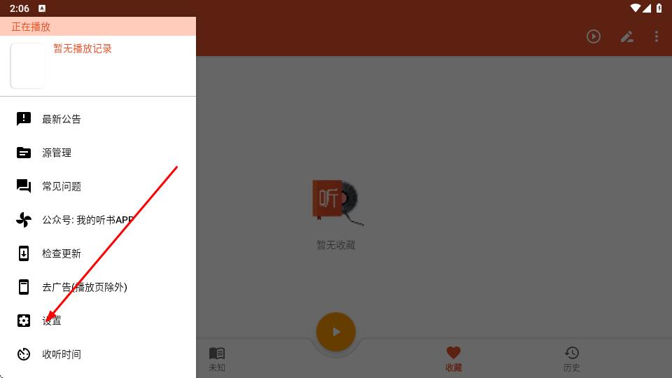 1、打开“我的听书”APP,在左侧弹出菜单中,点击【设置】选项,进入设置界面进行功能配置。