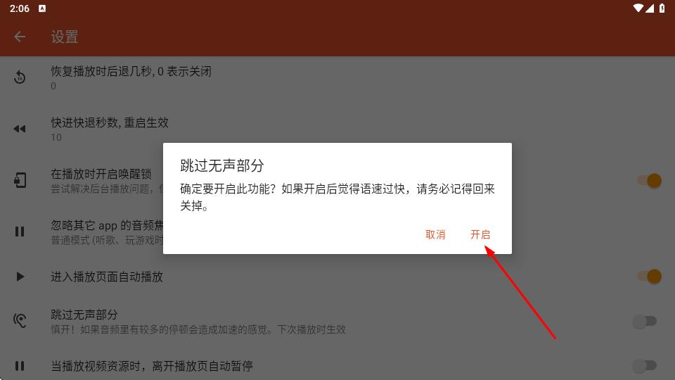 3、向下滑动设置页,找到【跳过无声部分】选项,点击开启弹出确认框,选择【开启】,可让音频播放跳过无声间隙。