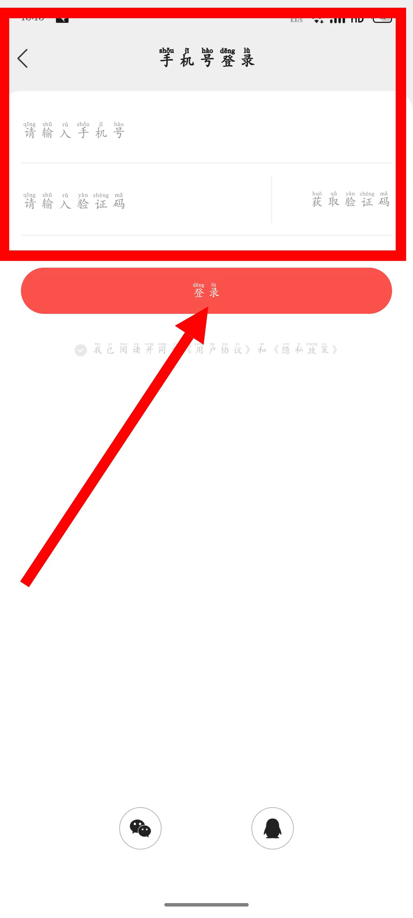 4、在手机号登录页面,输入手机号和验证码,点击登录。