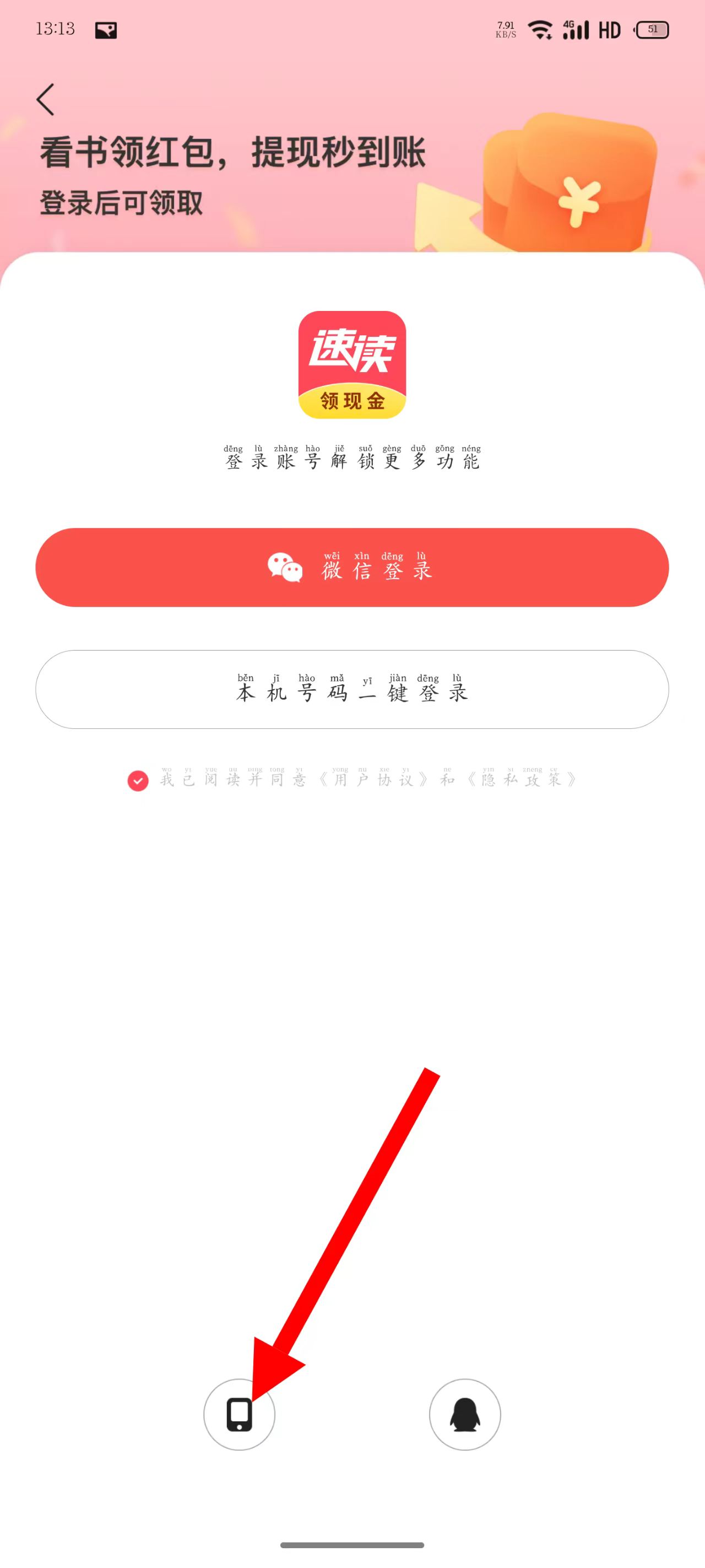 3、进入登录页面后,点击下方手机图标。