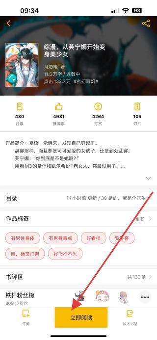 3、点击目标作品进入详情页,点击立即阅读按钮,即可免费阅读该小说。