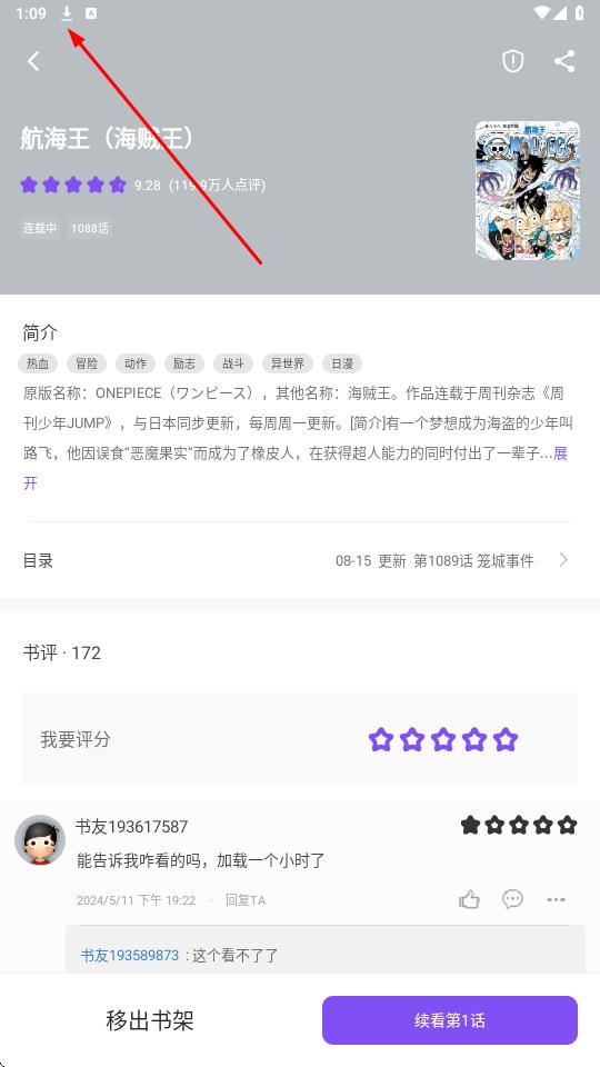 3、打开漫画详情页面,点击左上角的下载图标,可对《航海王海贼王》等漫画进行下载操作。