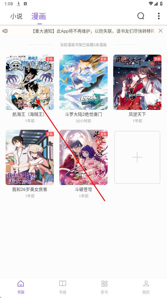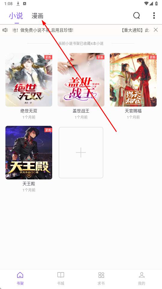 1、在书架界面,点击顶部漫画标签,切换至漫画书架查看已收藏的漫画作品。