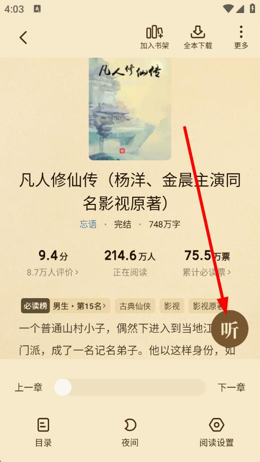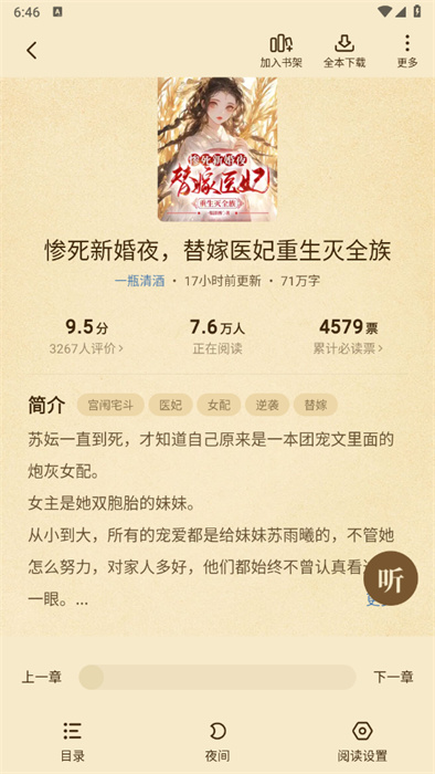 3、在小说详情页面,阅读简介等信息确认后,点击页面右下角的听按钮,即可开始收听该小说,享受听书服务。
