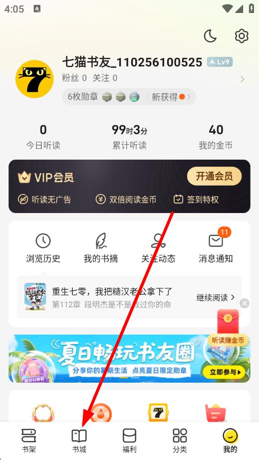 1、打开七猫小说APP,进入我的页面后,点击底部导航栏中的书城选项,进入书城界面,这里有丰富的书籍资源。