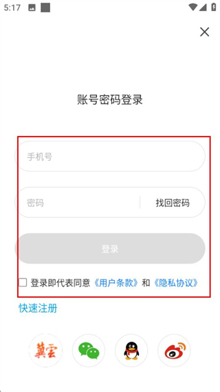 3、在登录页面,填写信息并勾选协议后,点击登录完成账号登录。