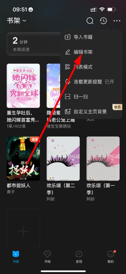 2、点击···后,弹出功能菜单,从中选择编辑书架选项,进入书架编辑状态。