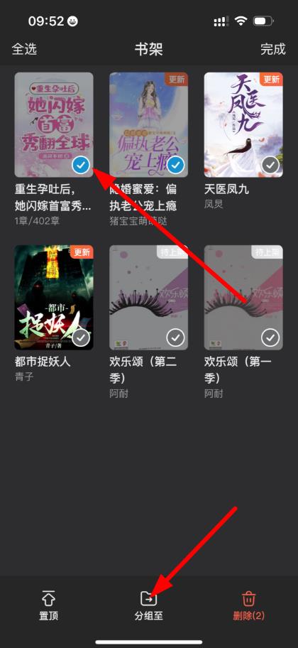 3、进入编辑状态后勾选要操作的书籍,点击分组至等按钮对书籍进行分组等编辑操作。