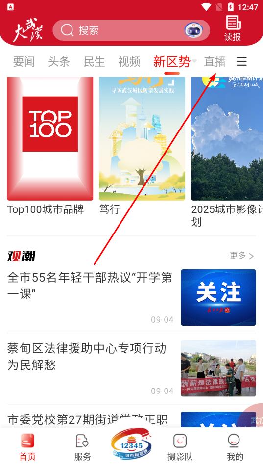 1、打开大武汉App,进入首页,点击上方导航栏中的直播选项。