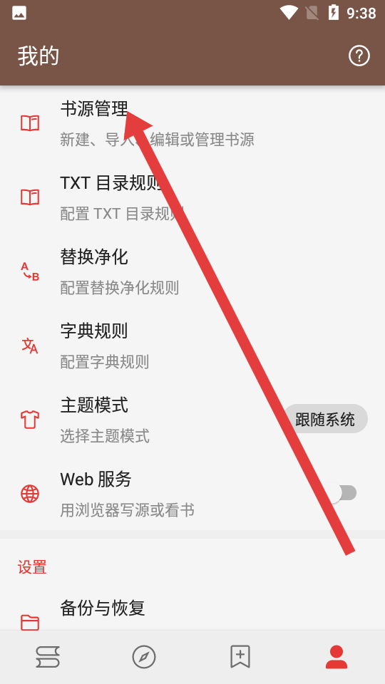 1、打开阅读APP,点击右下角图标,进入我的页面,点击书源管理选项,进入书源管理界面。