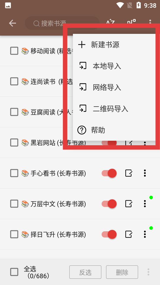 2、进入书源管理界面后,找到右上角的三点图标并点击,弹出下一步的操作菜单。