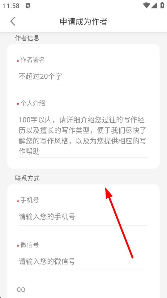 4、在申请成为作者页面,依次填写作者署名、个人介绍、手机号、微信号等必要信息,完成后按提示提交申请等待审核即可。