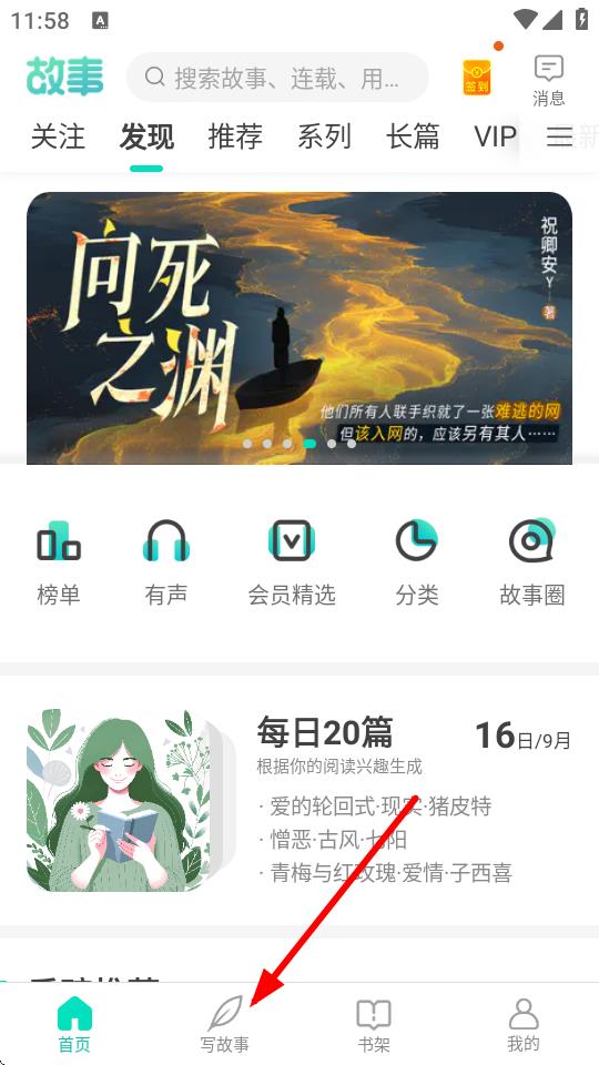 1、打开每天读点故事App,点击底部导航栏中的写故事选项。