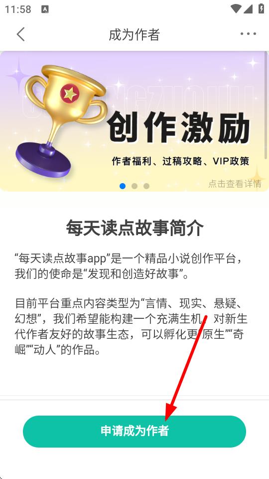 2、进入写故事页面后,点击成为作者按钮,进入成为作者相关介绍界面。