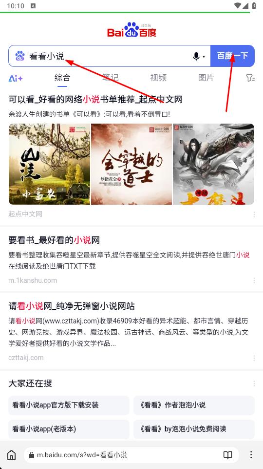 2、在百度搜索框内输入看看小说,点击搜索框右侧蓝色百度一下按钮,结果页呈现起点中文网书单推荐、小说网站链接等内容,包含《会穿越的道士》等作品封面及简介展示。