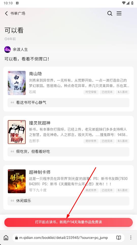 3、点击搜索结果进入起点读书书单广场页面,浏览《南山隐》《撞灵就超神》等书单详情,页面底部设有红色按钮,标注打开起点读书,新用户14天海量作品免费读。