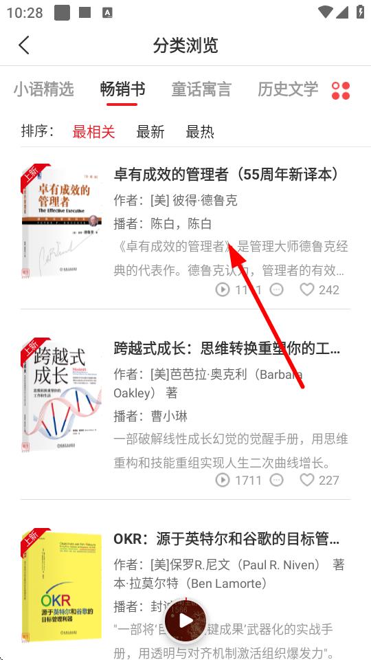 2、在分类浏览页面中,找到想要听的书籍,比如卓有成效的管理者55周年新译本,点击该书籍进入详情页。