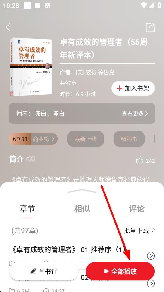 3、在书籍详情页中,点击下方红色的全部播放按钮,即可开始播放该书籍内容。