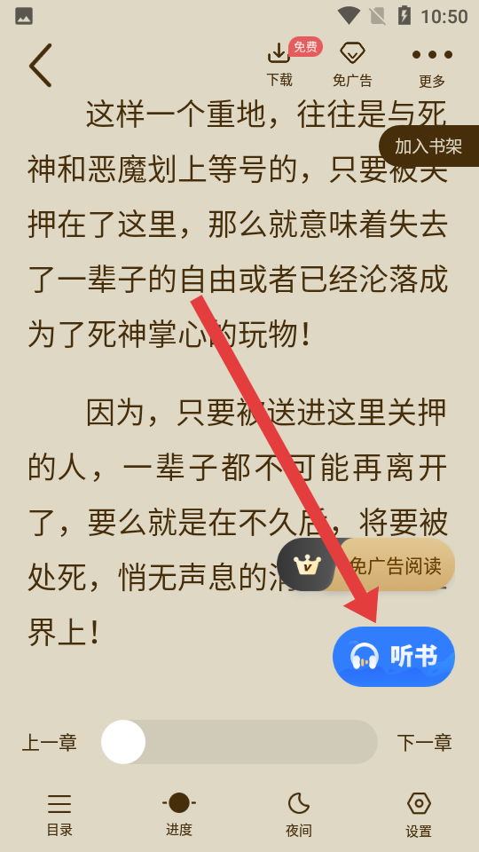 3、在阅读界面中,点击底部的听书按钮。