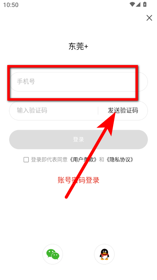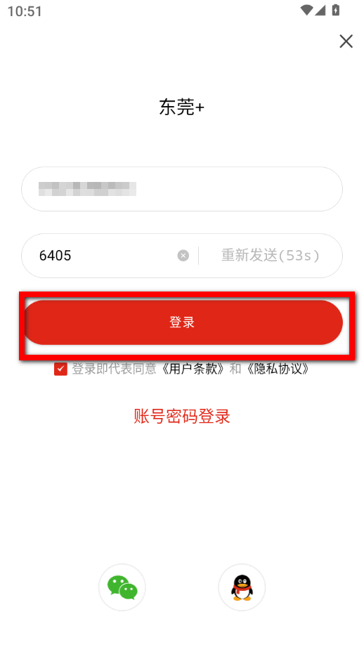 4、输入收到的验证码点击登录按钮,完成东莞新闻app账号注册操作。