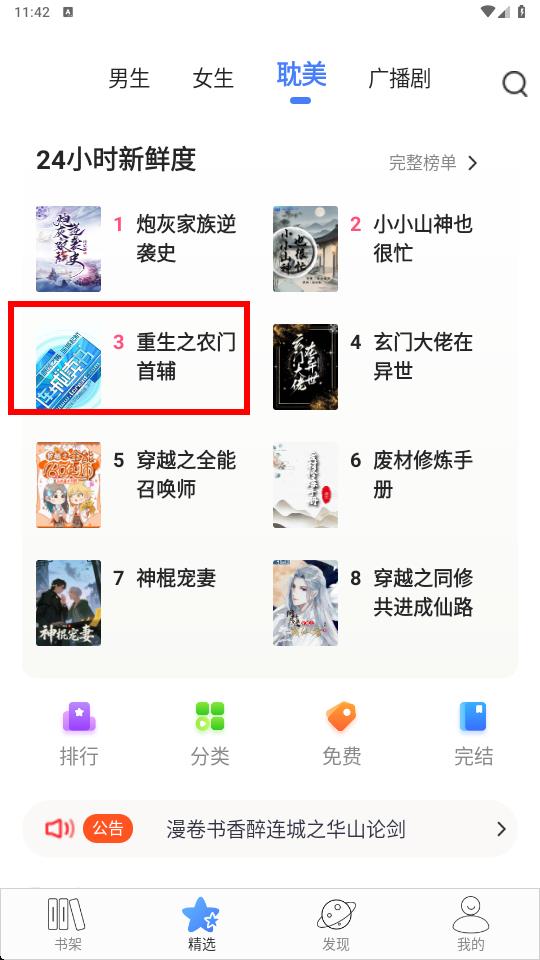 1、打开连城读书进入精选页面,切换到想看的分类,找到感兴趣小说重生之农门首辅并点击进入阅读。