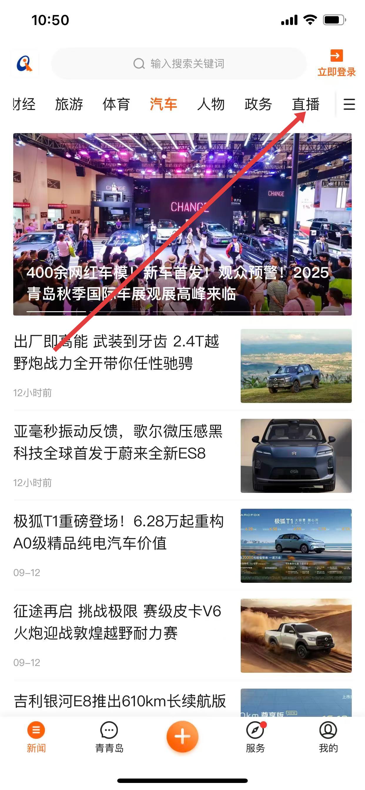 1、打开青岛新闻App,点击首页上方导航栏中直播选项。