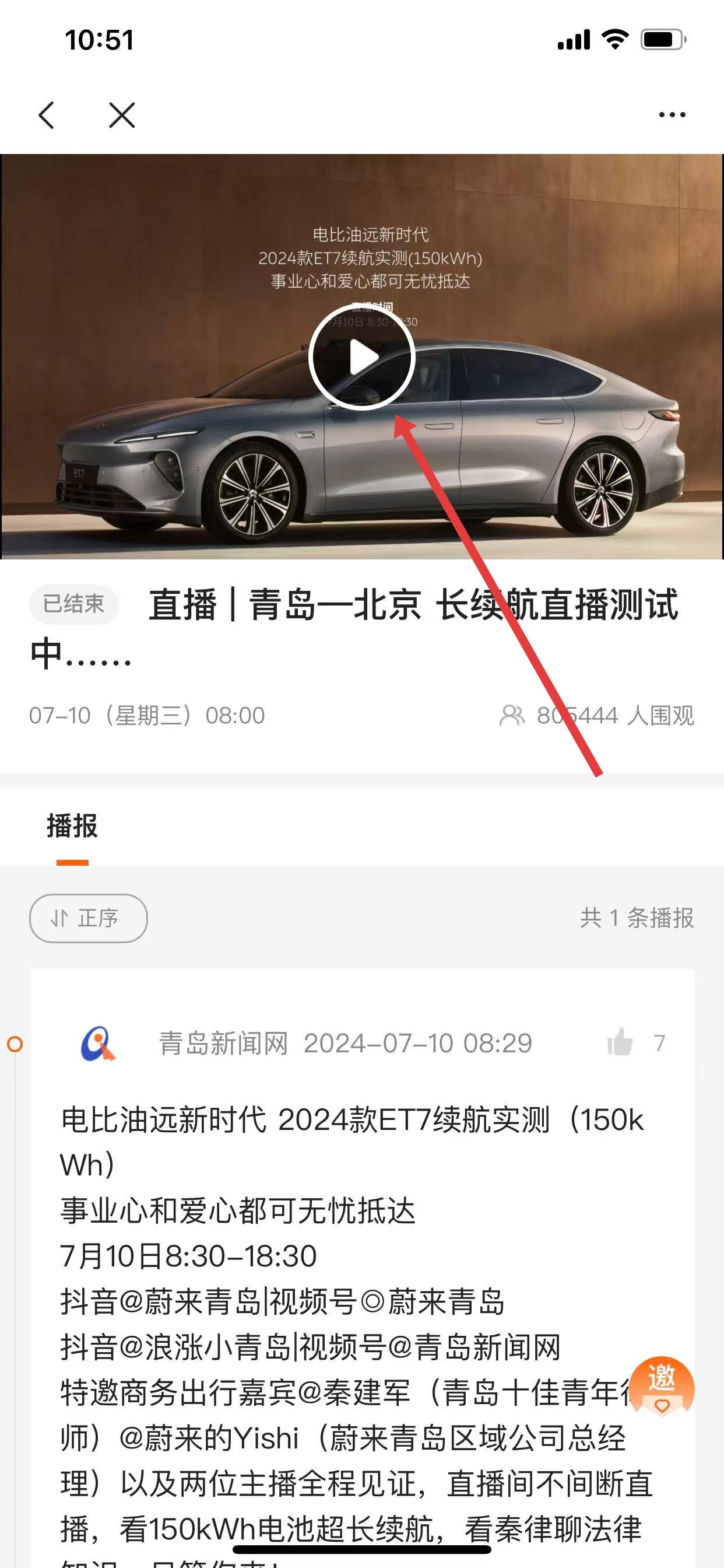 3、进入直播详情页面,点击视频区域的播放按钮,观看直播回放。
