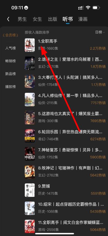2、在听书专区的各类榜单如会员榜、人气榜等中,选择想听的书籍,比如点击全职高手。