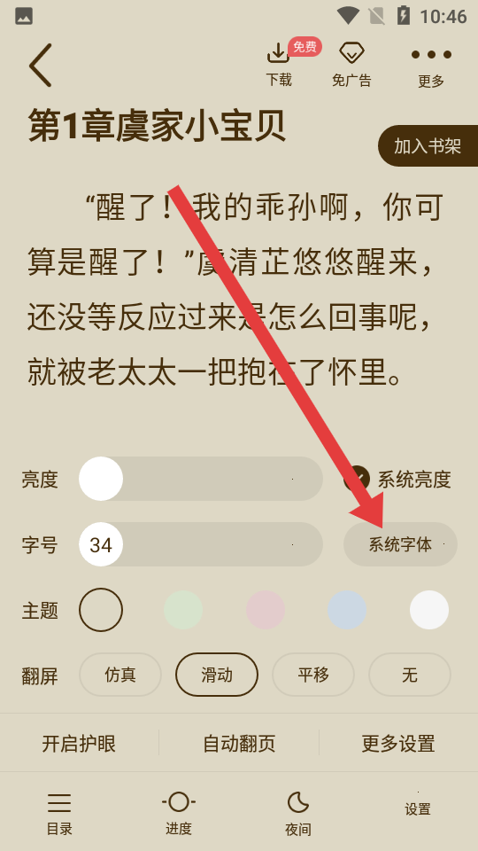 4、在设置菜单里,找到字号旁边的系统字体选项,来更改小说字体样式。