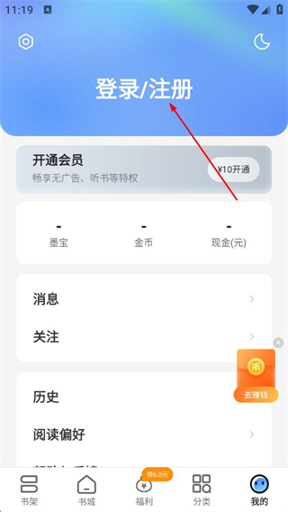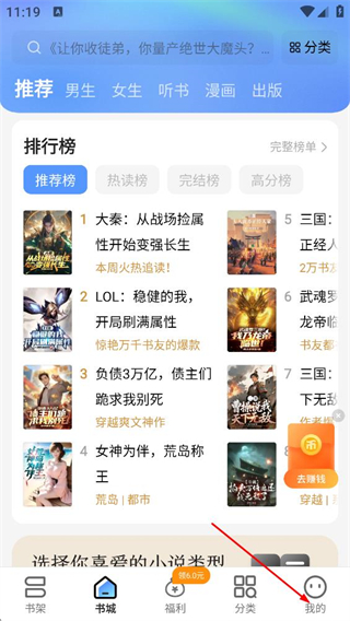 1、在浩看小说首页,点击底部的我的选项,进入个人页面。