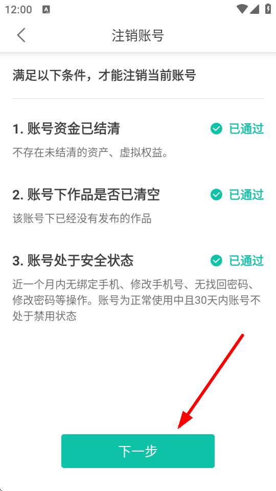 4、在注销账号页面,确认自己满足账号资金已结清、账号下无作品、账号处于安全状态等注销条件后,点击下一步,并按照后续提示完成注销操作。