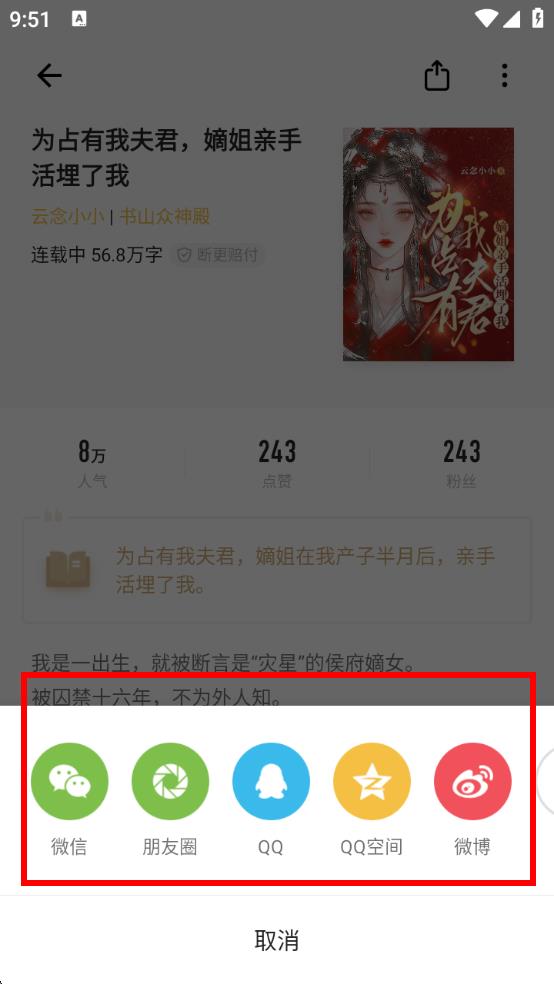 2、进入书籍详情页面,点击右上角的分享图标唤起分享选项。