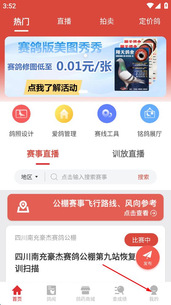 1、打开赛鸽相关APP,进入首页后,找到页面右下角的“我的”选项,点击该选项,进入个人页面。
