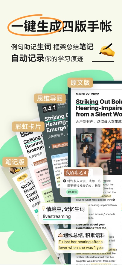 3.阅读过程中的每个生词都可以即时添加到自己的学习计划中,利用扇贝强大的记忆系统进行学习。
