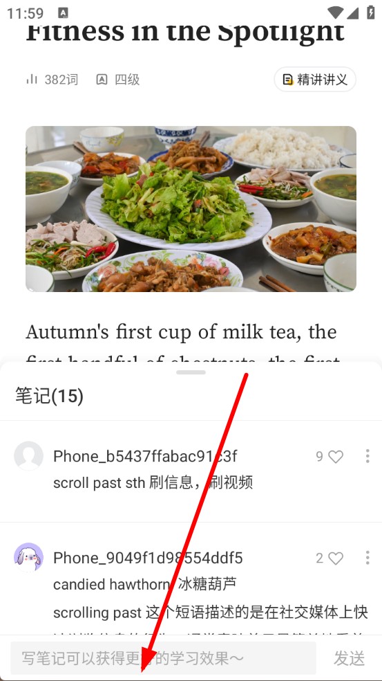 3、在下方弹出的笔记输入框中,输入你对该单词或句子的理解、注释等内容即可。