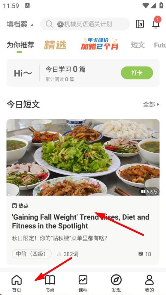 1、打开扇贝阅读APP,进入首页,选择一篇想要阅读的短文,点击进入文章界面。