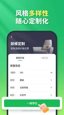 2.透明价格预估 :用户输入房屋面积、类型、风格、地区等基本信息后,可一键预估装修价格,使装修花费更加透明清晰,方便用户提前规划预算。