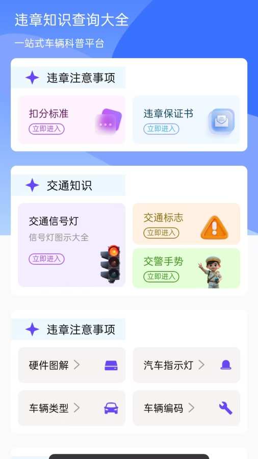 这是一款专为车主设计的一站式交通信息服务APP,旨在帮助用户提供实用的交通指南,并普及交通知识,让出行更加安全便捷。•违章代码查询:了解交通违章相关知识,输入代码一查便知。•交通指南:提供全新的交通规则和道路信息,帮助用户了解行车路线、路况和限行规定,确保出行顺畅。•交通知识:内置丰富的交通安全知识和驾驶技巧,让用户更好地理解和遵守交通法规,预防违章行为的发生。 来自应用汇: 交通违章查查