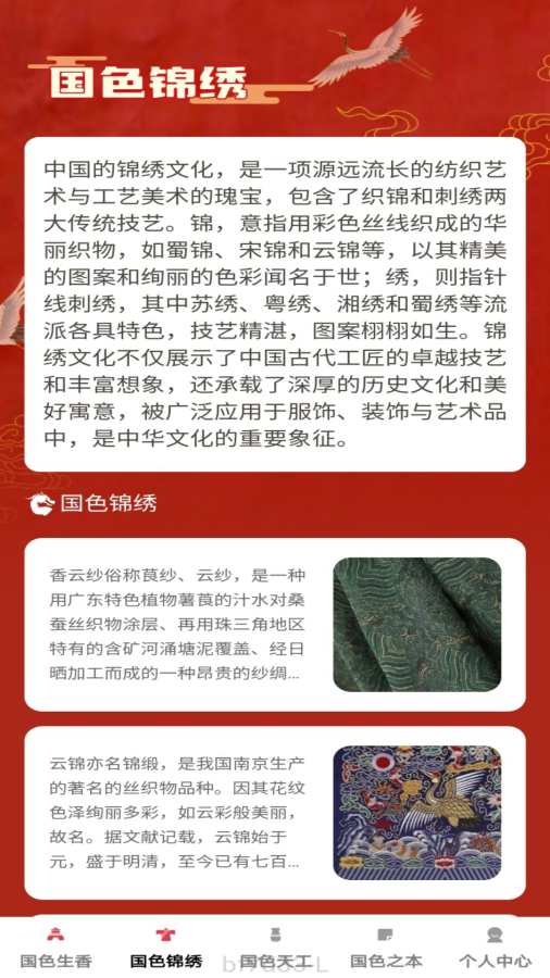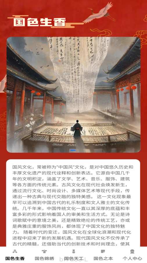 国色每刻是一款致力于弘扬中华文化之美的应用,通过多角度、多维度的方式,带您领略中国传统文化的精髓,探索中华民族的艺术瑰宝,感受劳动人民的伟大智慧和美好品质。【国色生香】深入浅出地介绍国风文化,让您在每日的点滴中感受到中华文化的独特魅力;【国色锦绣】全方位展示我国的锦绣制品,如蜀锦、壮锦等,让您领略锦绣之美,感受匠心独运;【国色天工】细致讲解中国传统手工艺技术,如打铁花等,让您感受技艺传承的精彩与匠人的智慧;【国色之本】将主题升华,回归至劳动人民伟大智慧和美好品质的传承,引领您深度理解中华文化的核心价值,体会时代精神。国色每刻,带您每时每刻都在品味中华之美。