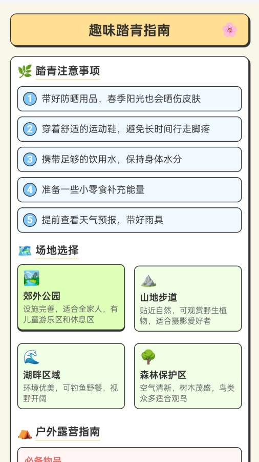 “踏趣世界行”,为您开启趣味十足的旅行体验。“趣味踏青指南” 提供贴心注意事项,推荐郊外公园等场地,还有户外露营必备物品清单,让踏青轻松愉快。“世界风光大全” 介绍美国等国家风光,涵盖景点、旅游及徒步路线,助您领略全球美景。“旅行记账” 方便记录餐饮等费用,掌握旅行开支。“踏趣世界行” 从游玩攻略到财务管理,全方位满足旅行需求,伴您趣游世界。 来自应用汇: 踏趣世界行