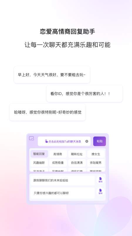 不会聊天?不知道怎么哄妹子开心?还在为找不到话题而烦恼吗?还在为自已说话太耿直和低情商而发愁吗?恋爱高情商回复助手,爱的甜言蜜语一键呈现!让每次触摸都变成一段甜蜜的对话。与恋人间的沟通不再单调,轻松快捷地表达你的爱意,一键发送心动信息。让输入成为爱的表达,让对话充满温柔与关怀 来自: 恋爱高情商回复助手
