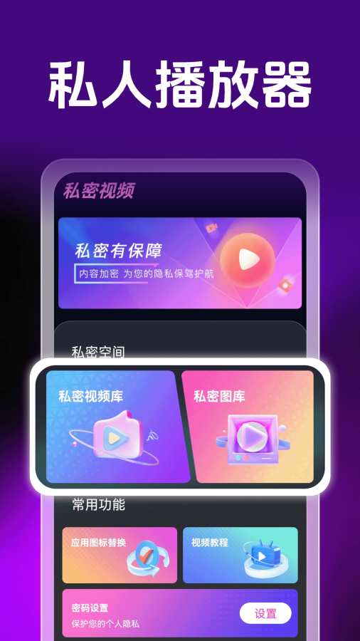 一款融合视频播放与隐私防护的应用,专注为您营造私密专属空间,由隐藏加密形式播放视频,全面保障您的隐私安全。仅需将手机里的视频与图片导入应用,设定专属密码,您的私密资料就能完美隐藏,不被他人轻易发觉。