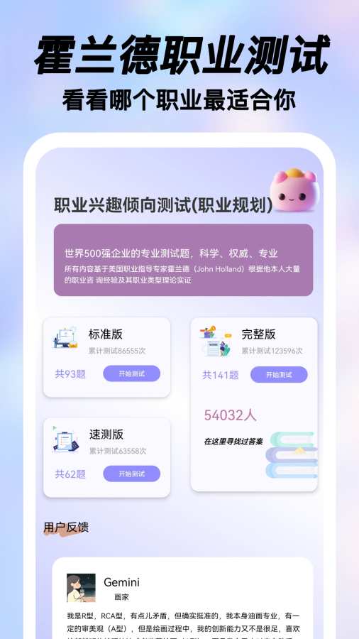 「测评类型丰富」多类心理健康测评,有关乎职场的职业性格测评、职场竞争力测评,有发掘你的人格魅力评估、智商检测器等;还有为你提供专业的测评解读,让你更好的了解自己。