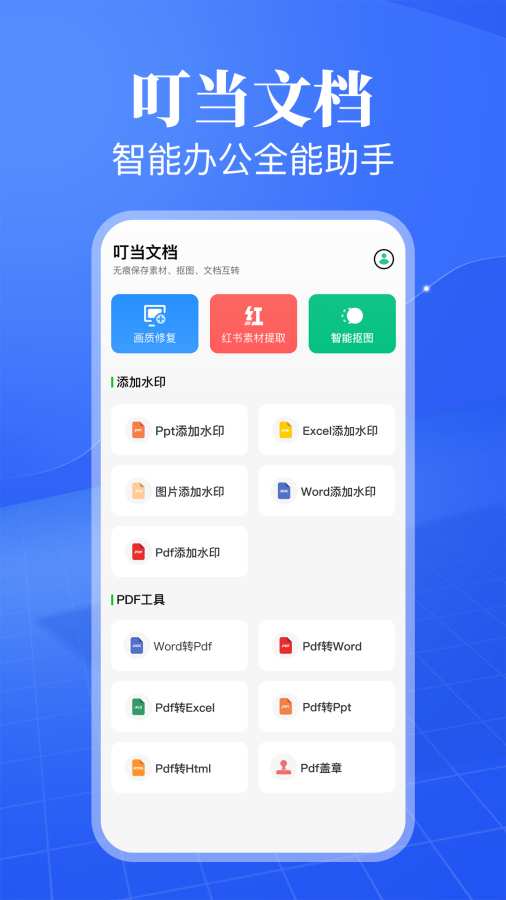 叮当文档——智能办公全能助手一键解锁专业级文档处理,效率提升300%!质修复:模糊文档/图片秒变高清,老档案焕然一新 素材提取:精准识别图中文字/表格,1秒转可编辑文本 智能抠图:复杂背景自动清除,证件照/产品图抠图无毛边 格式互转:pdf⇋Word/PPT/Excel,格式零失真水印防护:自定义文字/图片水印,防泄密溯源更安心 来自: 叮当文档
