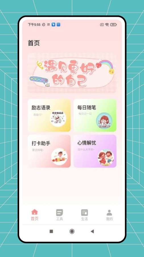 以 “遇见更好的自己” 为理念,设置 励志语录(提供正能量语句,助力心态激励 )、每日随笔(支持日常心情、感悟记录 )、打卡助手(可设定目标,进行坚持打卡监督 )、心情解忧(提供情绪疏解内容与互动,缓解负面情绪 )板块,从习惯养成、情绪管理,陪伴成长 。