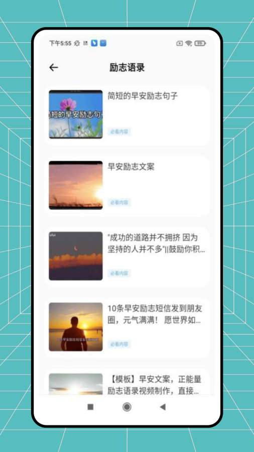 作为首页功能延伸,汇聚丰富励志内容,含早安励志句子、文案,以及鼓励坚持、传递正能量的语录,还有可用于朋友圈分享的励志短信模板、视频制作素材,为用户提供日常激励与表达素材 。