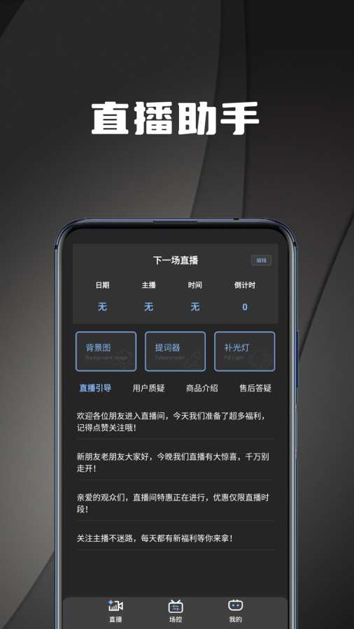 感谢对直播场控鸭助手的下载和使用,这是一款直播场控人工具:一、直播辅助工具,倒计时用户下一次直播时间,更有提词器、背景图、补光灯、常用话术各种工具二、场控人助手,场控流程完成过程记录,场控常用音效,场控效果实时跟踪记录。 来自: 直播场控鸭助手