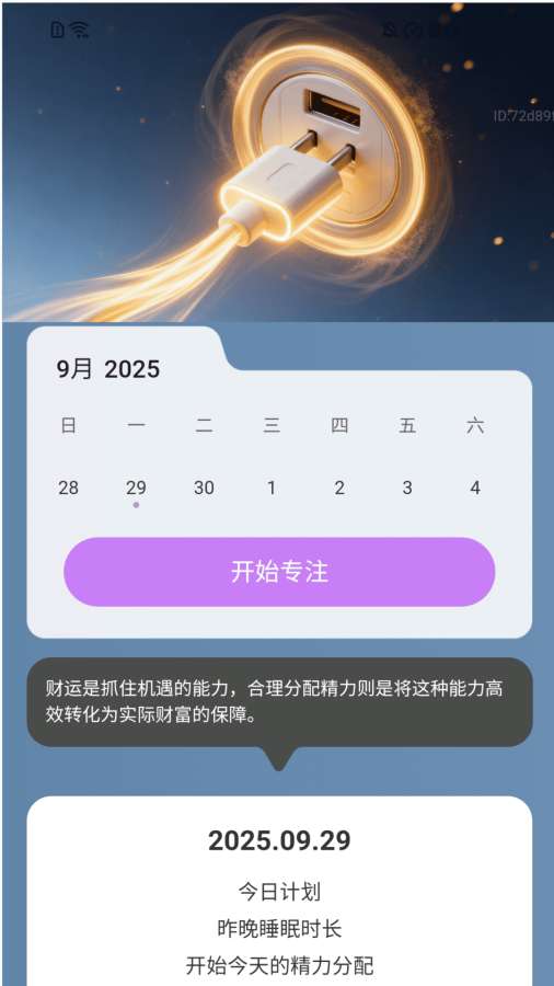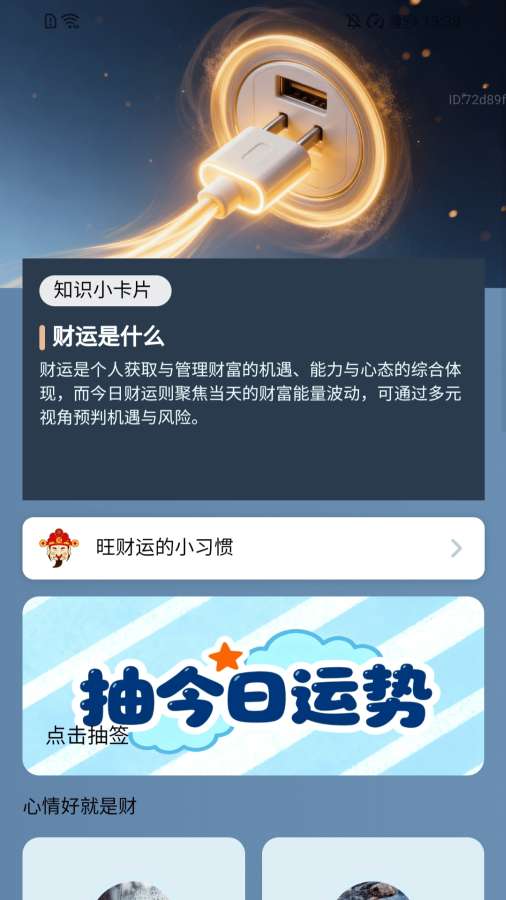 这款应用功能丰富且贴心。充电方面,有 “充电护卫”,能检测耗电应用,进行电量保护,还可开启 “强力省电” 模式,同时提供多种充电、满电、断开的提示音供设置,让你及时知晓充电状态。运势相关,有 “知识小卡片” 讲解财运,还有 “旺财运的小习惯” 推荐以及 “抽今日运势” 功能,增添生活趣味。时间与专注管理上,有日历显示,可点击 “开始专注”,还能查看今日计划、昨晚睡眠时长,助力合理分配精力,从充电守护、运势探索到时间与精力管理,多维度为你提供服务。 来自: 财运充进来